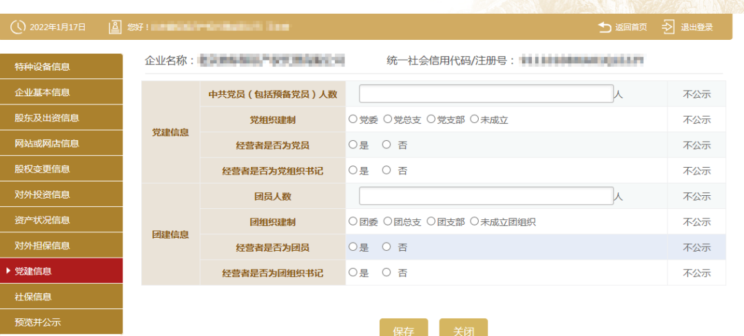 11、填写党建信息。党建信息为不公示信息,主要采集私营企业党组织的建立情况,但属于抽查范围,请注意如实填写。其中,中共党员(包括预备党员)人数,为截至年度报告年份12月31日的人数。如企业暂无党员,填写“0”人后点击保存即可。