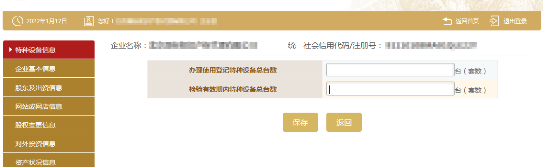 13、特种设备使用情况。这一项本年度新增项,请按实际情况填写办理使用登记特种设备总台数以及办理使用登记特种设备总台数。