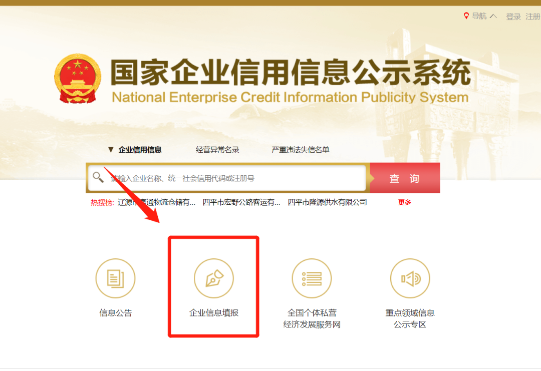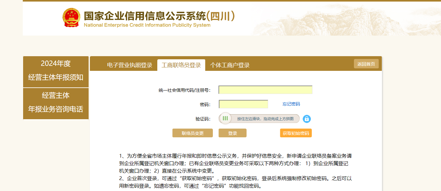 1、点击“企业年报-年报入口”到“国家企业信用信息公示系统(四川)”页面或直接登录“国家企业信用信息公示系统”页面。