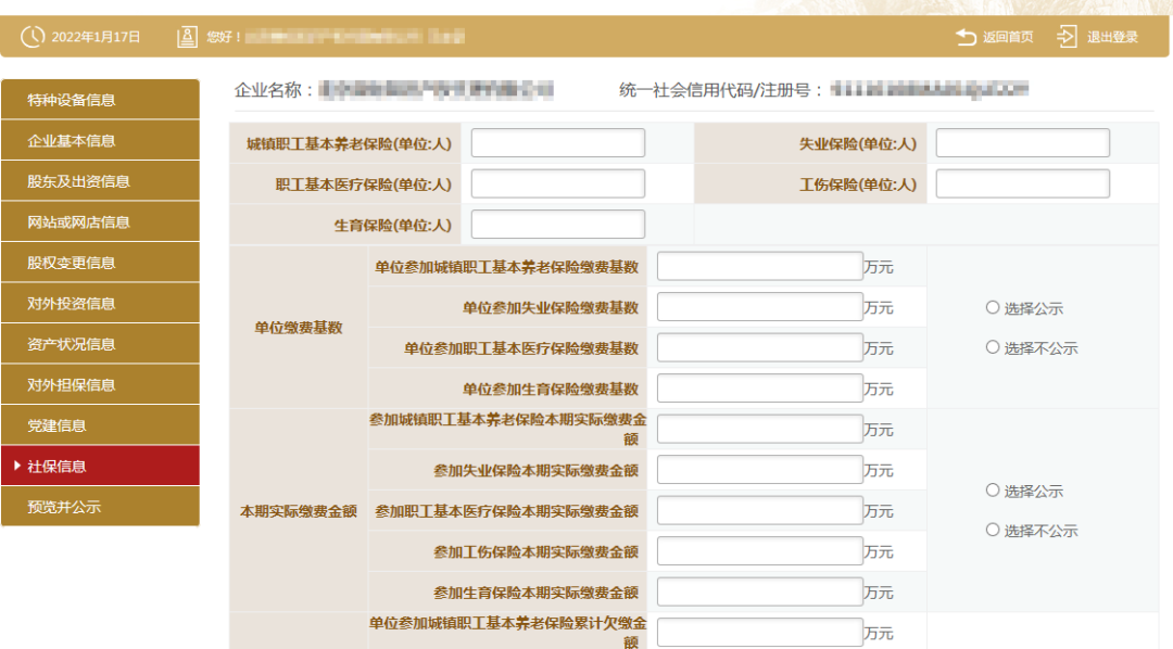 12、填写社保信息。参保各险种人数指报告期末参加社会保险的职工人数(不含离退休人数)。单位缴费基数指报告期内单位缴纳社会保险费的工资总额,按缴费人员的应缴口径计算。本期实际缴费金额指报告期内单位实际缴纳的社会保险费,不包括补缴欠费和跨年度(或跨季度)的预缴金额。单位累计欠缴金额指截至报告期末单位累计欠缴各项社会保险费金额(本金)。如还未缴纳社保,则在各处填写“0”。