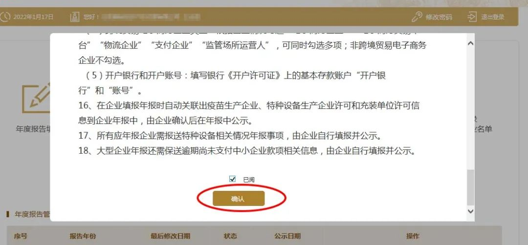 弹出年报须知,阅读后,在下方“已阅”前的小框内“√”(打勾),再点确认。如果以前存在没有参加年报的年度,需要将以前年度补报后才可申报本年度的。
