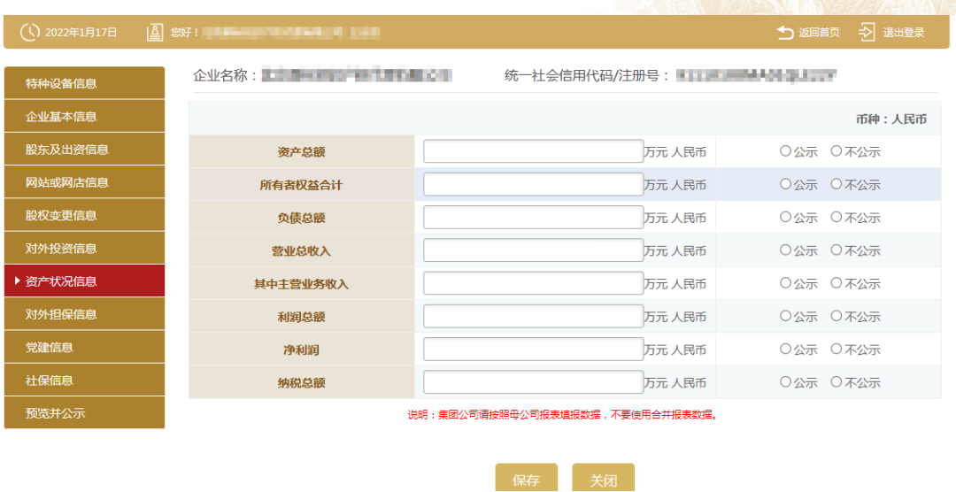 根据审计报告、资产负债等如实填写企业资产状况,若选择“公示”则对外公示,若选择“不公示”,则公示查看该指标不对外公示,显示“不公示”。