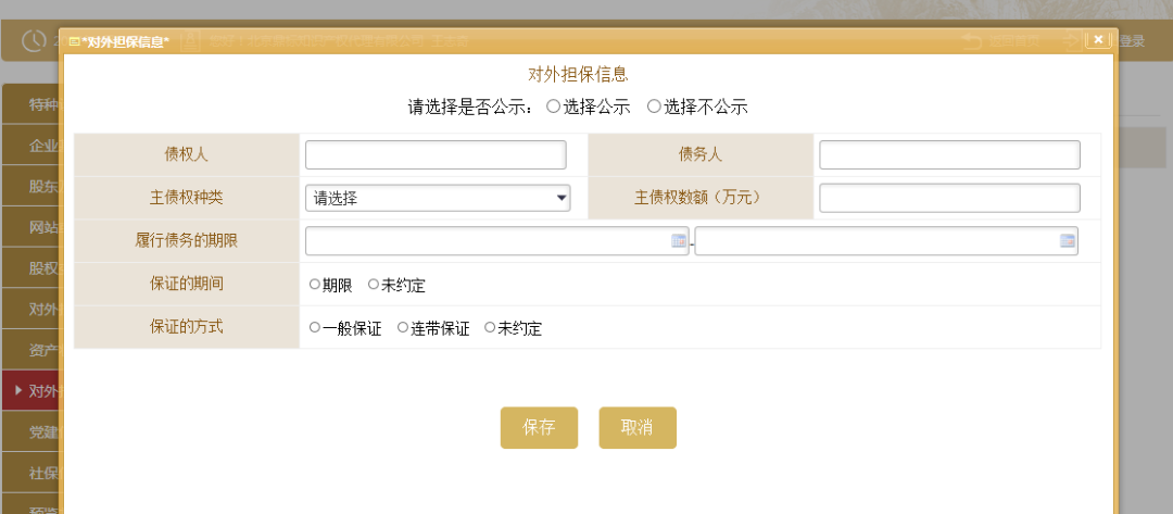 10、填写对外担保信息。点击左边的对外担保信息,根据实际情况进行添加之后点击“保存”。(如无对外担保情况的则无需填写此项信息)