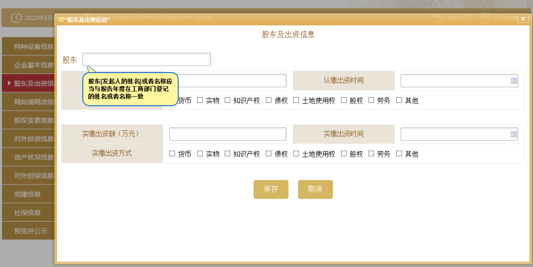 6、填写股东及出资信息,点击“添加”进行填写。(分公司无需填写)按照公司章程上约定的填写股东出资额及出资时间,每一个股东(发起人)的出资信息只需填报一条,股东(发起人)认缴和实缴出资额为截至报告年度12月31日的累计数额;认缴和实缴出资时间为截至报告年度12月31日最后一次认缴和实缴时间,出资方式可以多选。点击“保存”。如还未发生实缴,则实缴部分暂时不需填写,填写认缴信息后即可保存。注意:系统默认填写数额单位为万元,填写时要注意核对数额大小准确性!只填写数字即可,不要在数字后面加“万”字,否则不能保存。