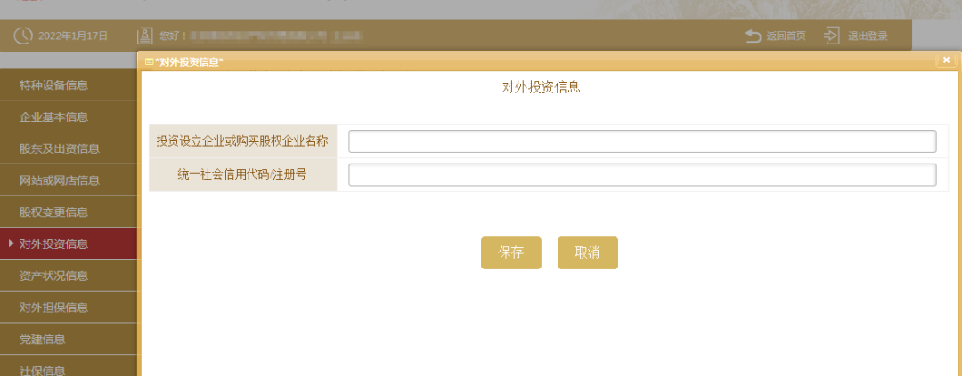 8、填写对外投资信息。点击左边的“对外投资信息”,之后再根据实际情况点击“添加”填写相关信息,填写完成后点击“保存”。如无对外投资情况变更的则无需填写此项信息。