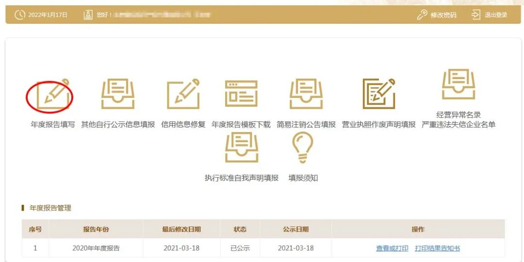 4、点击左上角“年度报告填写”。