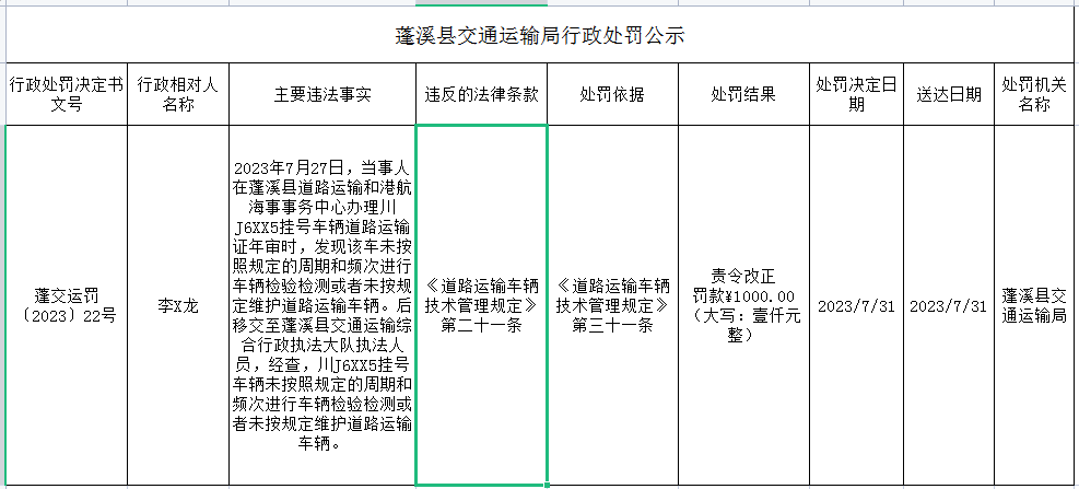蓬溪县交通运输局行政处罚公示