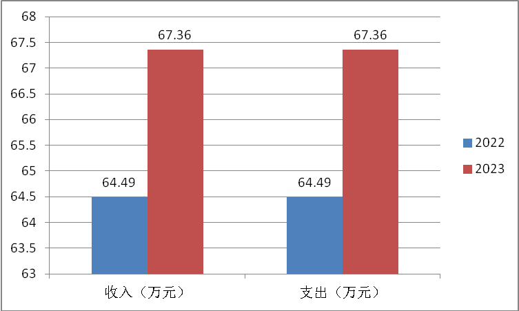 2023年度收、支总计均为67.36万元。与2022年度相比,收、支总计各增加2.87万元,增加4.45%。主要变动原因是23年县地方志办公室并入,人员增加。