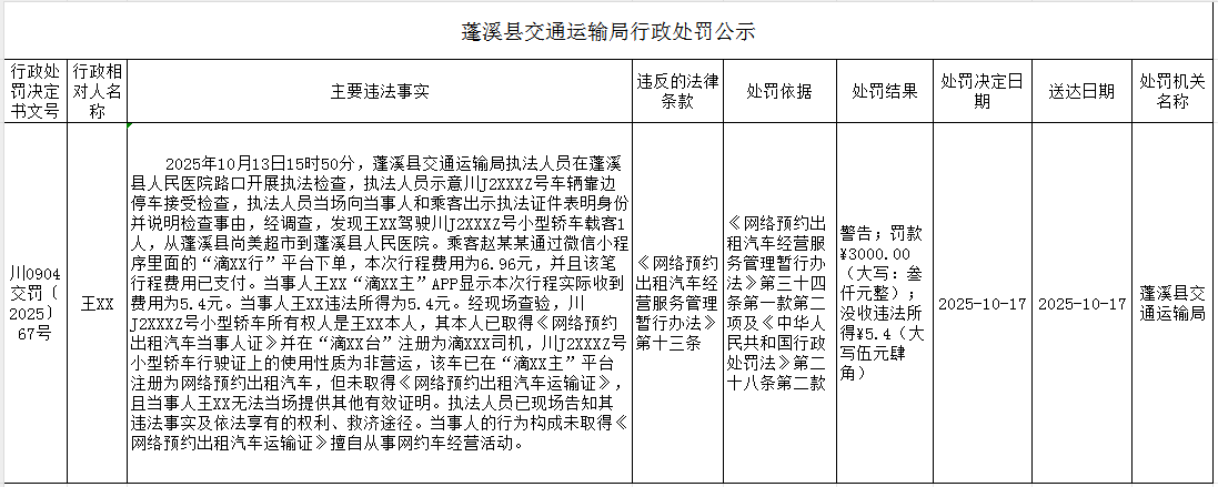 蓬溪县交通运输局行政处罚公示