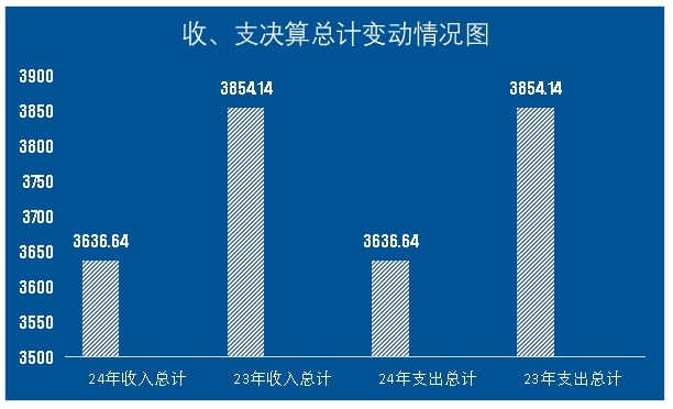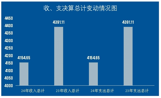 2024年度收、支总计均为4154.65万元。与2023年度相比,收、支总计减少236.46万元,减少5.38%。主要变动原因是本年退休教师及教师调出增加。