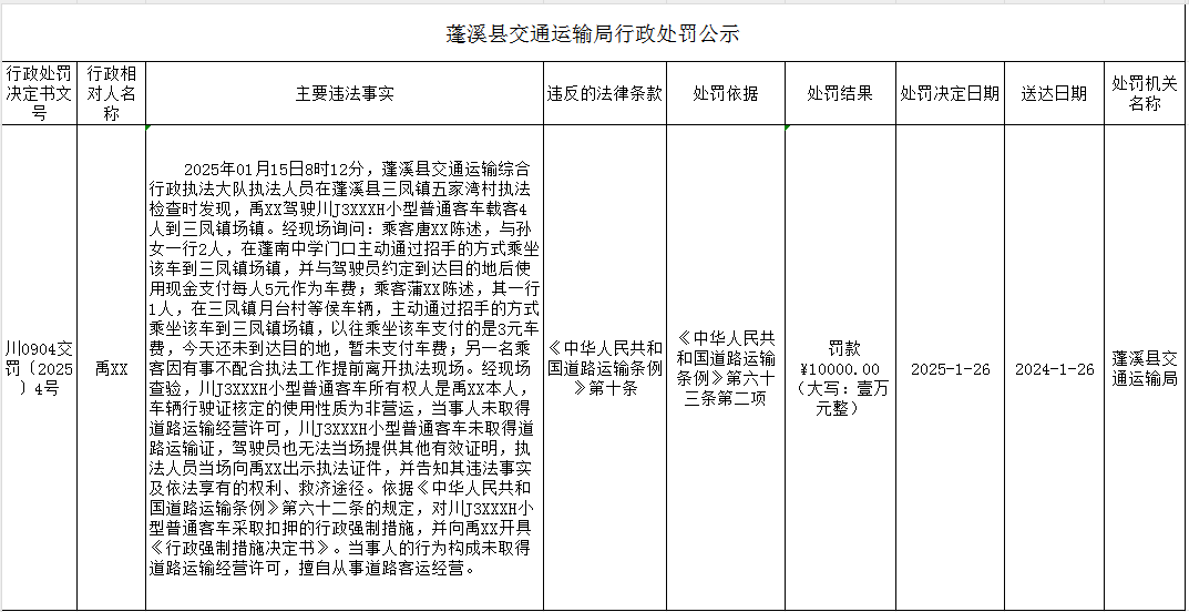 蓬溪县交通运输局行政处罚公示