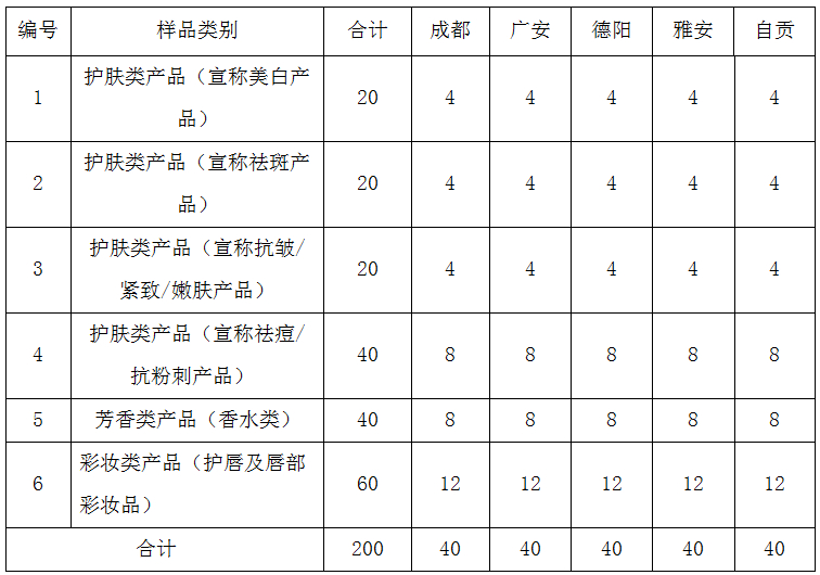 本次风险监测采样在成都、广安、德阳、雅安、自贡市进行,采集护肤类产品(宣称美白;宣称祛斑;宣称抗皱/紧致/嫩肤产品和宣称祛痘/抗粉刺产品)芳香类产品(香水类)、彩妆类产品(护唇及唇部彩妆品)共200个批次。具体批次分配见下表。