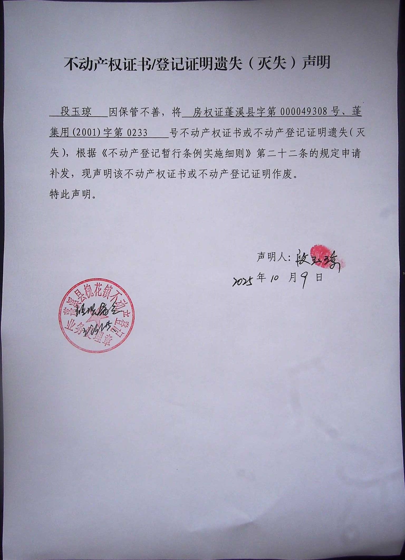 遗失补证公告(段玉琼)