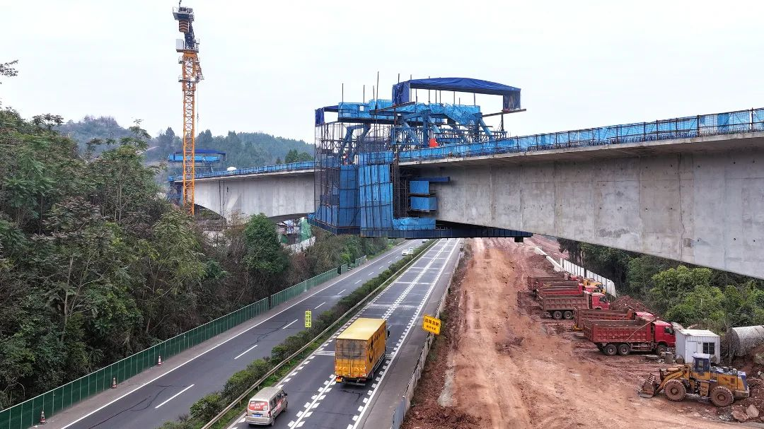 在蓬溪县赤城镇长虹村的大兴乡跨沪蓉高速特大桥建设现场,工人们正在距离地面数十米的高空进行连续梁施工。这座横跨沪蓉高速的特大桥,采用先进的悬臂浇筑法施工,桥下车辆川流不息,桥上施工有条不紊。为确保施工安全和下方车辆通行安全,项目方采用了挂篮全封闭兜底措施,并安排专人进行安全监控。这座连续梁是蓬溪境内唯一一座大跨连续梁,也是该项目的控制性工程。目前施工进度已经过半,计划今年3月完成连续梁合龙。