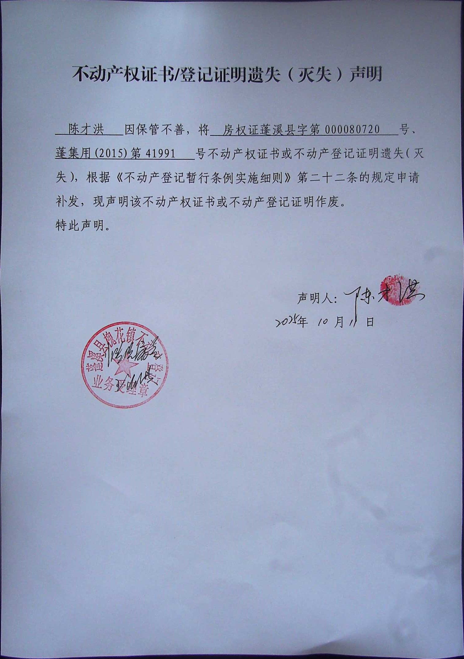 遗失补证公告(陈才洪)