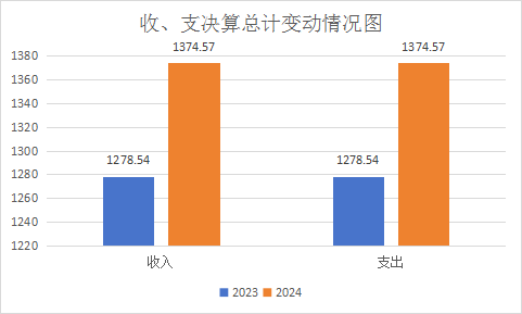 2024年度收、支总计均为1,374.57万元。与2023年度相比,收、支总计各增加96.03万元,增长7.51%。主要变动原因是增加了天福镇三合村基层综合治理服务站、天福镇茶房沟村组织生活体验馆暨党性教育实训站、蓬溪县第五次全国经济普查两员补贴、蓬溪县2023年乡镇级“五经普”考核奖补资金、项目经费、天福镇信访维稳专项经费、村级组织活动阵地建设、创建六好基层关工委经费、第五次经济普查补助(第三批)、第五次全国经济普查奖补资金等项目。