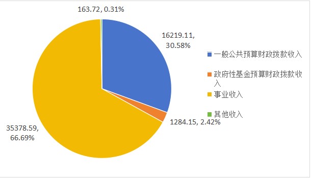 2024年度本年收入合计53045.58万元,其中:一般公共预算财政拨款收入16219.11万元,占30.58%;政府性基金预算财政拨款收入1284.15万元,占2.42%;事业收入35378.59万元,占66.69%;其他收入163.72万元,占0.31%。