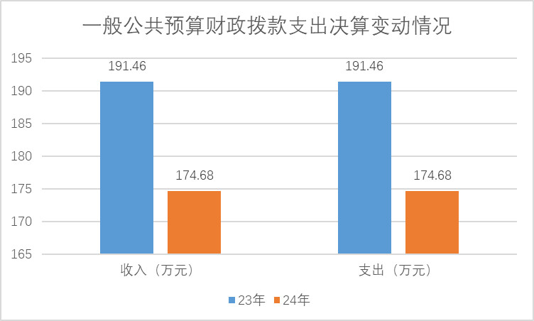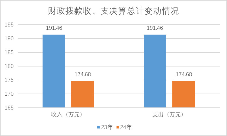 2024年度财政拨款收、支总计均为174.78万元。与2023年度相比,财政拨款收、支总计减少16.68万元,下降8.71%。主要原因是严格执行中央八项规定精神,厉行节约。