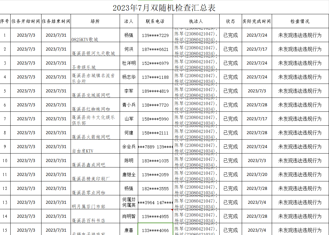 蓬溪县文化市场综合行政执法大队7月双随机检查汇总表