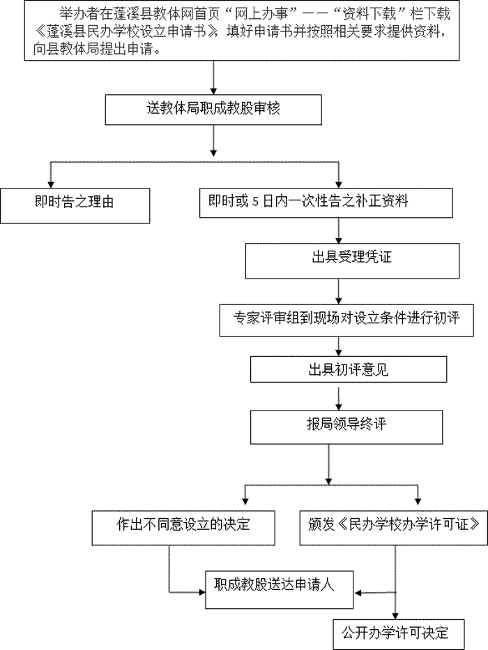 (四)审批程序:设立学前教育、小学教育、初中教育、非学历教育培训学校,由县教育体育局审批,并报市教育局备案;举办普通高中和中等职业技术学校由市教育局审批。(详见《设立民办学校流程图》)