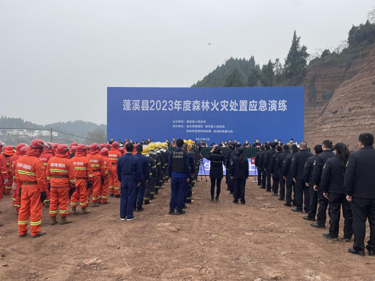 “蓬溪县明月镇深广村因村民李某祭祖用火不慎,引燃周边杂草,火苗、火星迅速窜升,不断形成多点地表火、树冠火和上山火。火借风势迅速蔓延,过火面积达150余亩,山下10余户近30名村民和1座加油站受到威胁,请求支援”。1月10日下午,蓬溪县12119值班室接到了森林火情报警电话,第一时间拉响警报。一场“突发的”森林防灭火演练迅速展开。