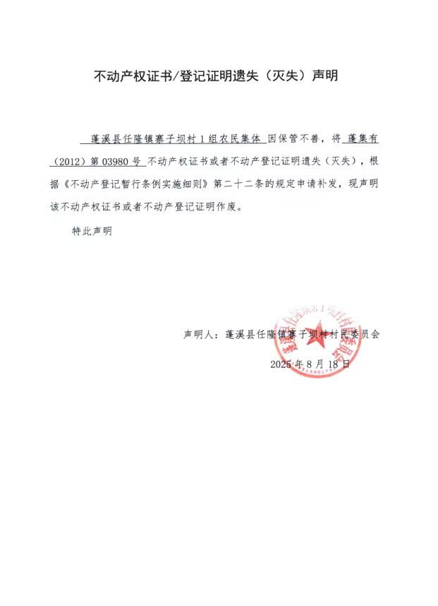 遗失补证公告(寨子坝村1组)