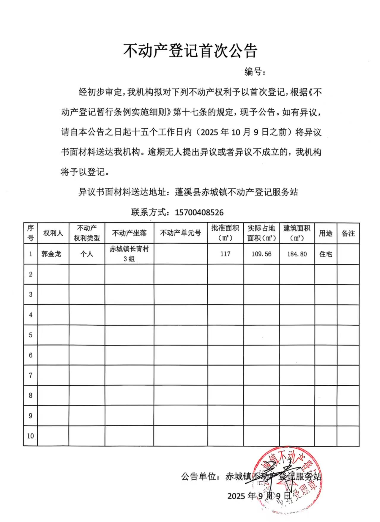 首次登记公告(郭金龙)