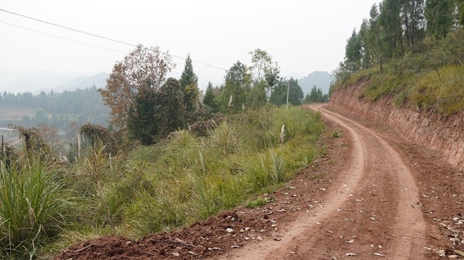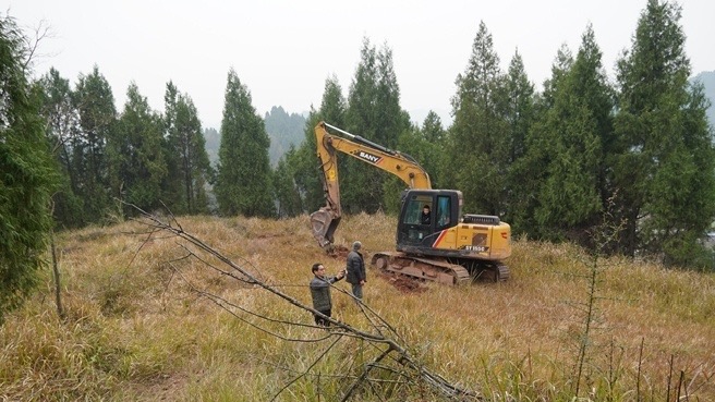 2021年1月5日,明月镇西林村坡上,挖土机正在忙碌地修机耕道、挖灌木、除荒草,它身后一条3米宽机耕道已现雏形。