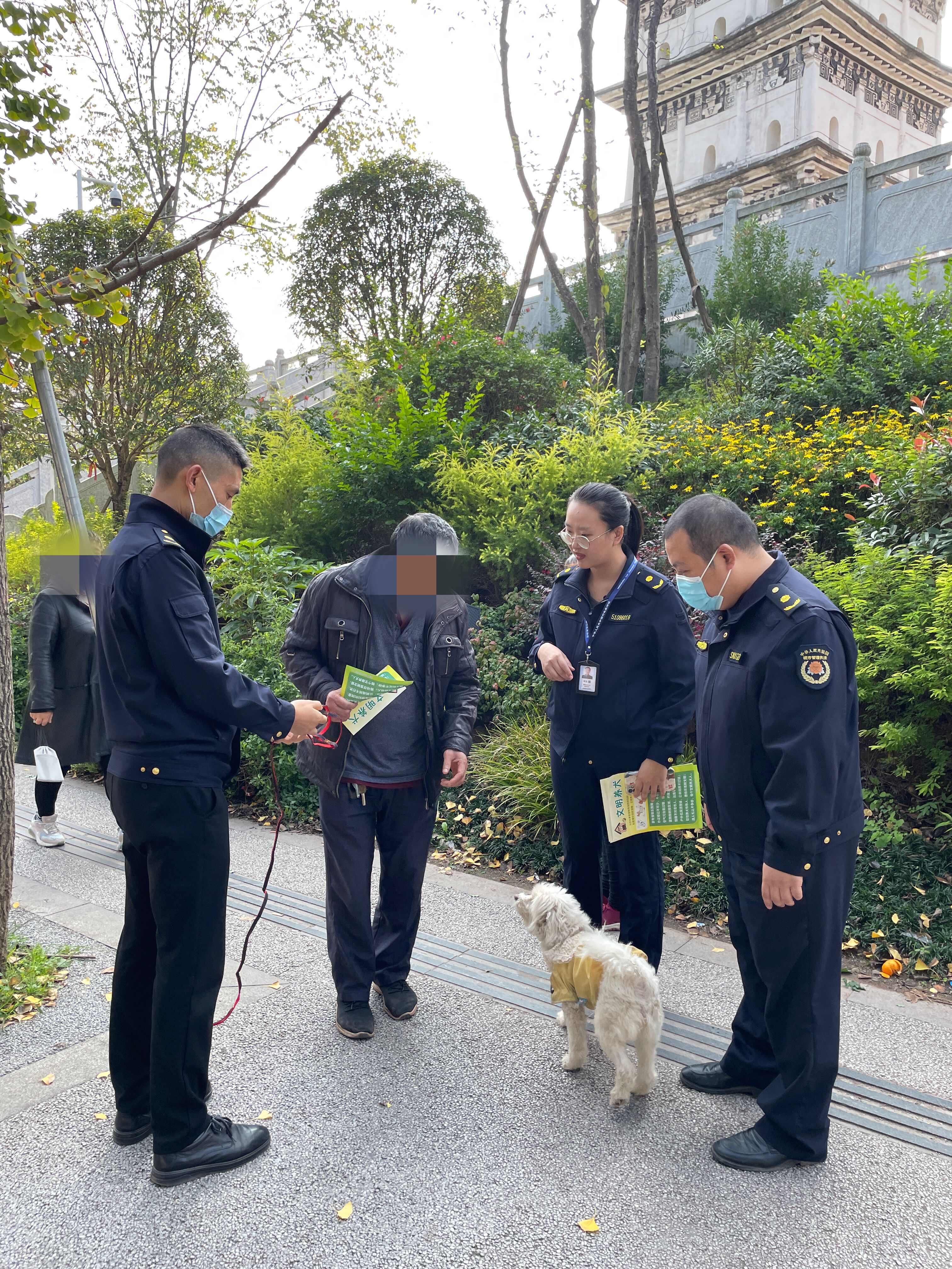 向市民发放文明养犬宣传单、遛狗绳
