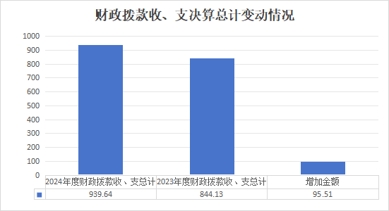 2024年度财政拨款收、支总计均为939.64万元。与2023年度相比,财政拨款收、支总计各增加95.51万元,增长11.31%。主要变动原因是增加县乡公路养护专项经费和蓬溪县大石镇天南路绿化栽植项目经费。