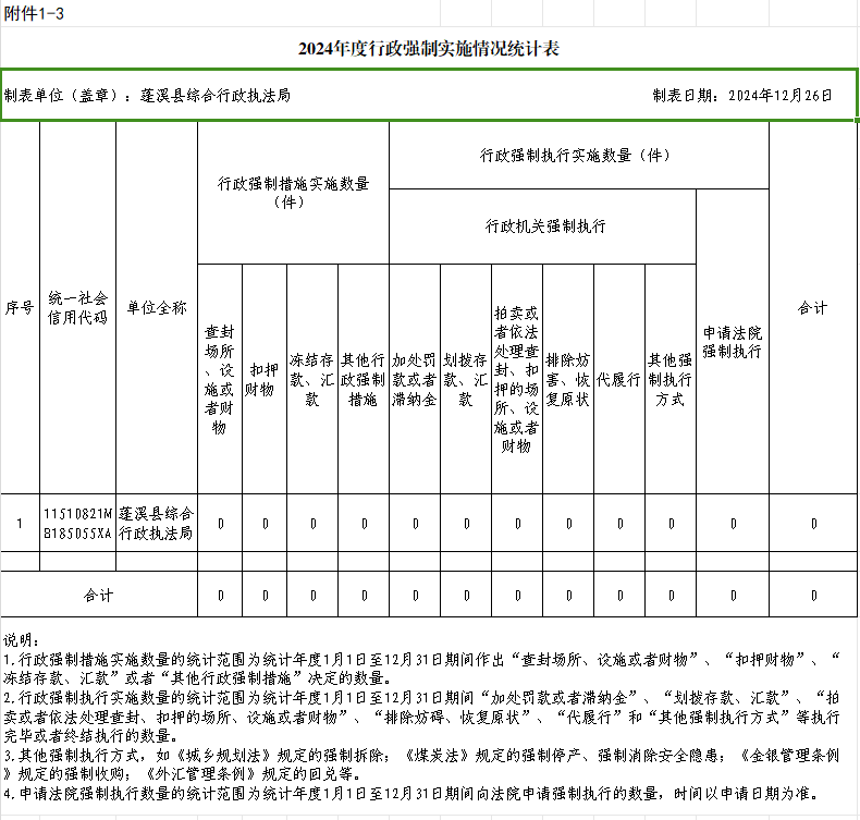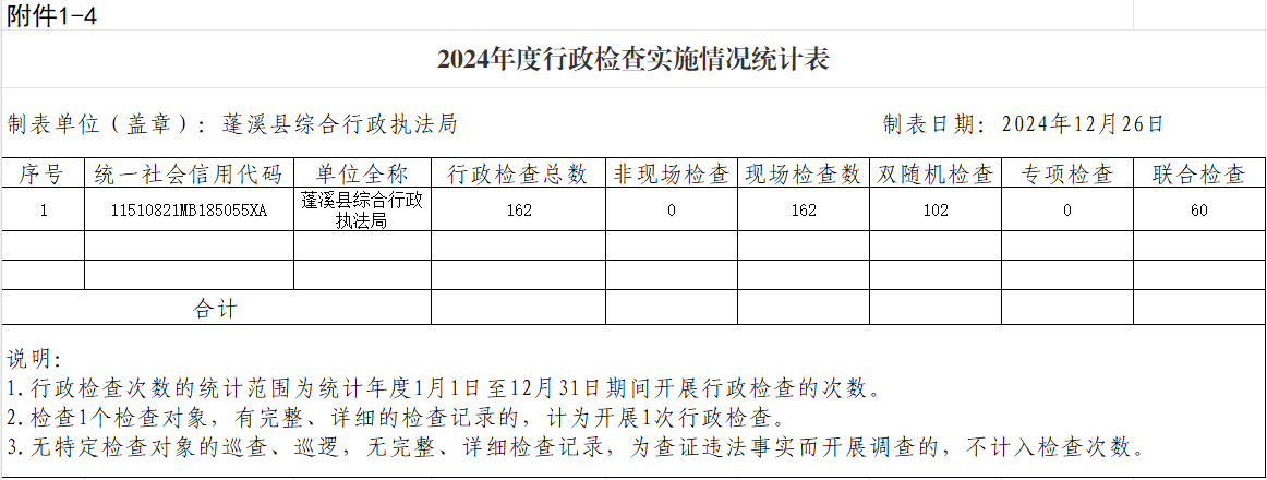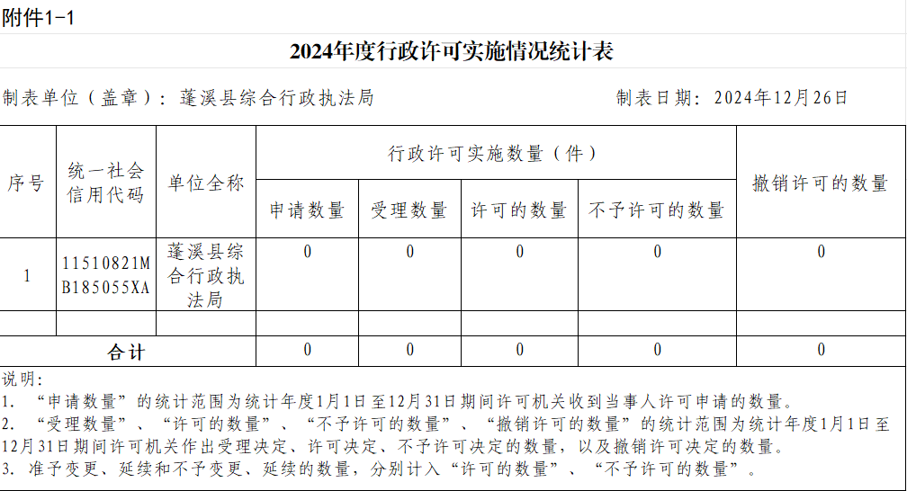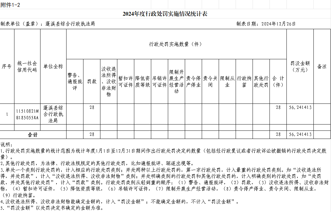 2024年度县综合执法局行政许可、行政处罚、行政强制、行政检查实施情况公示表
