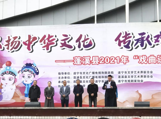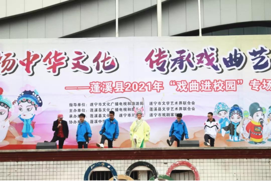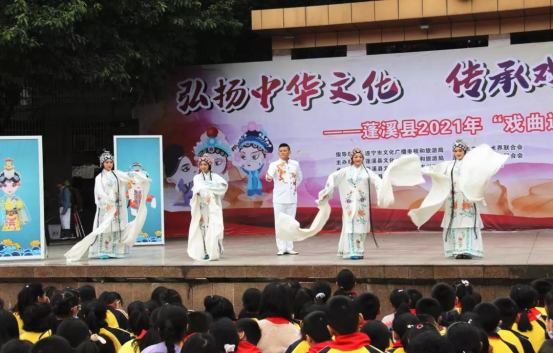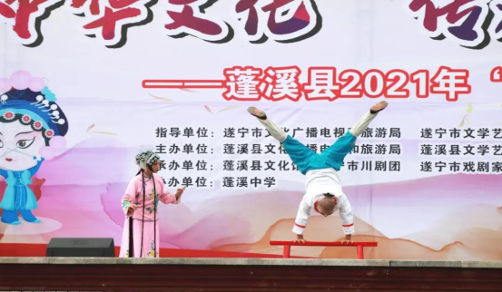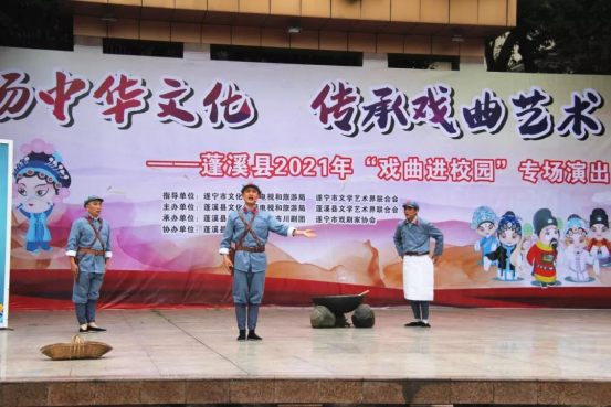 为进一步贯彻落实党中央关于支持戏曲传承发展的重要工作部署,10月21日,由遂宁市文化广播电视和旅游局、遂宁市文学艺术界联合会指导,蓬溪县文化广播电视和旅游局、蓬溪县文学艺术界联合会主办,蓬溪县文化馆、遂宁市川剧团、遂宁市艺术家协会承办的2021“戏曲进校园”专场活动在蓬溪中学和蓬溪县下河小学精彩上演。