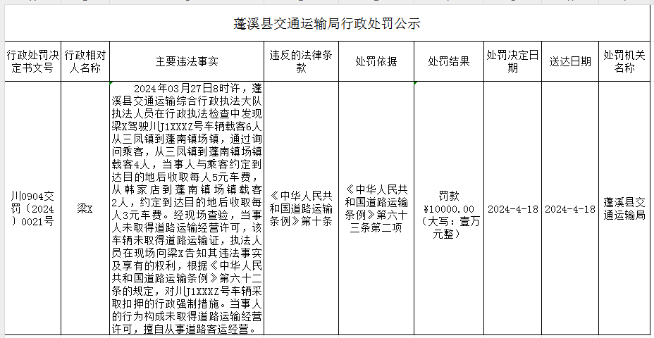 蓬溪县交通运输局行政处罚公示