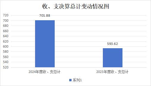 2024年度收、支总计均为701.88万元。与2023年度相比,收、支总计增加108.26万元,增加18.24%。主要变动原因是人员增加导致人员经费增加,全县社会网格化管理增加导致专项经费增加,全县毒品污水监测范围扩大,次数增加导致项目专项经费增加。