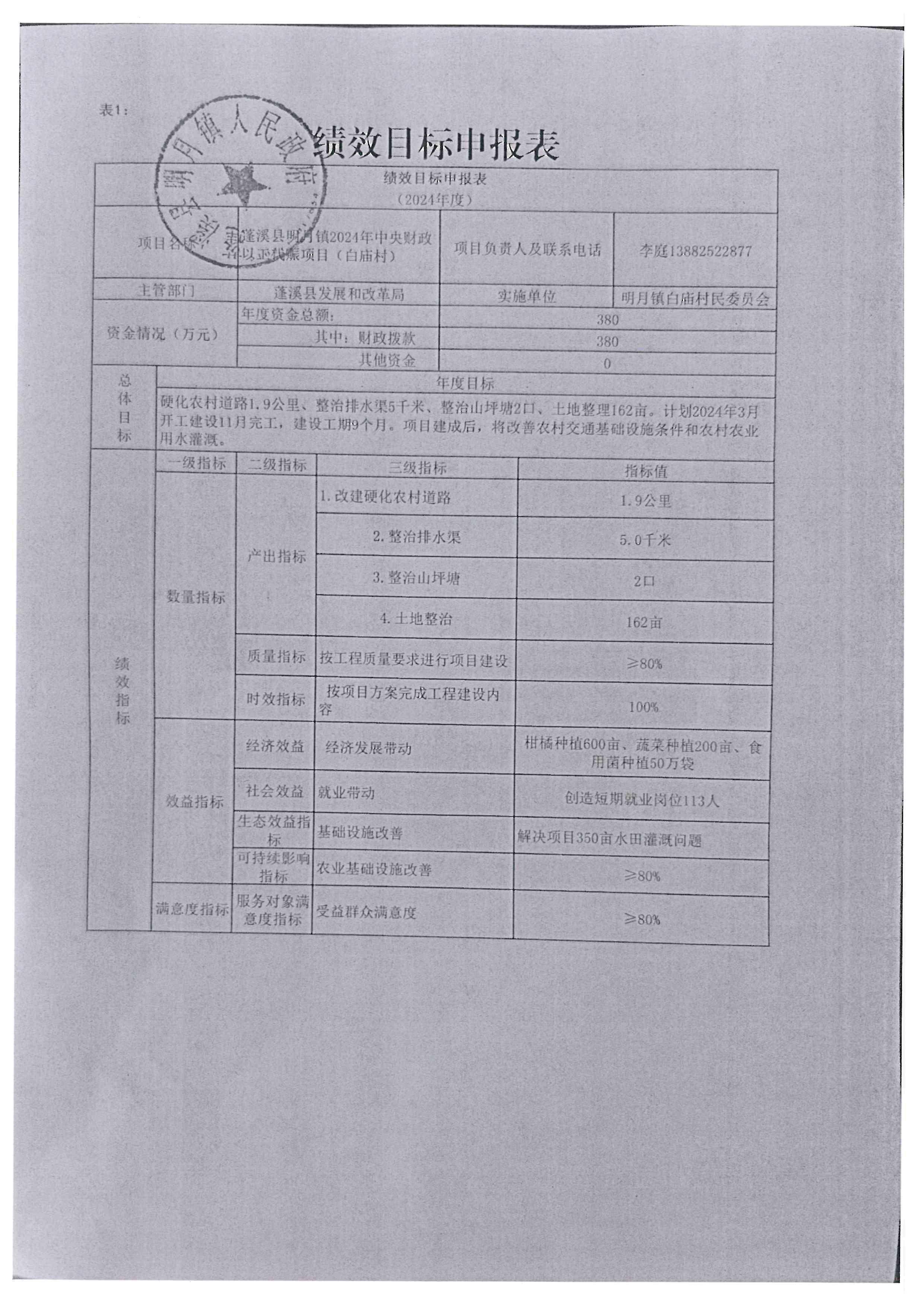 蓬溪县明月镇2024年中央财政以工代赈项目(白庙村)绩效目标申报公示