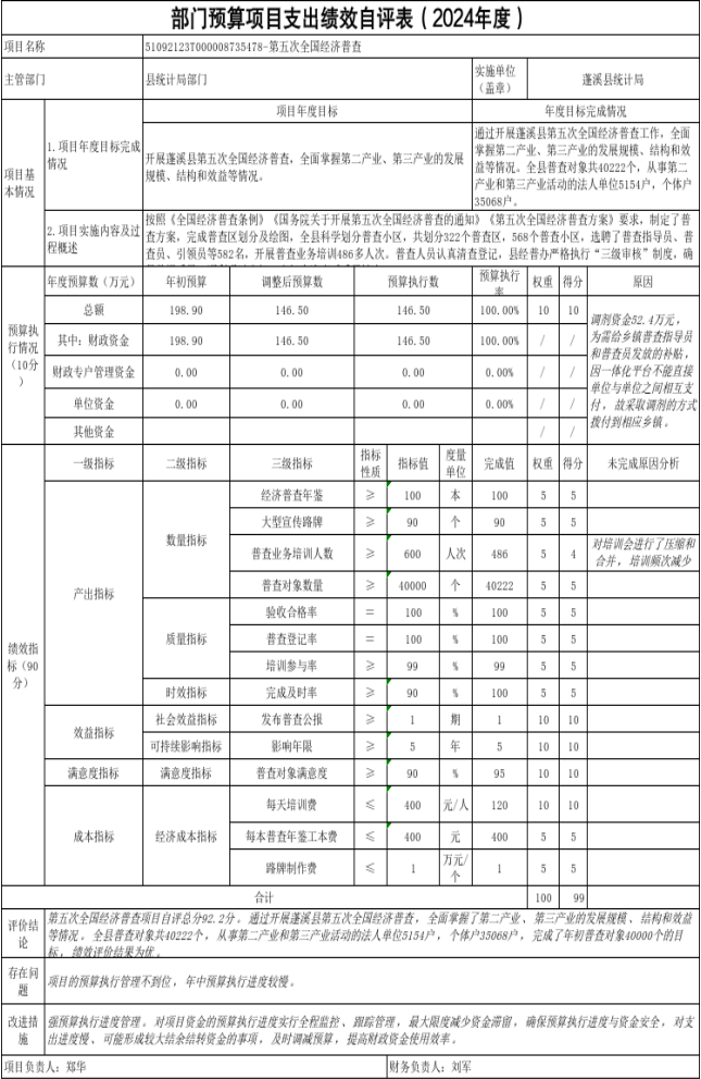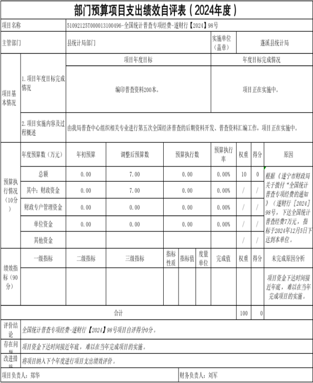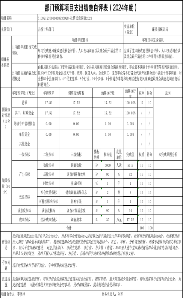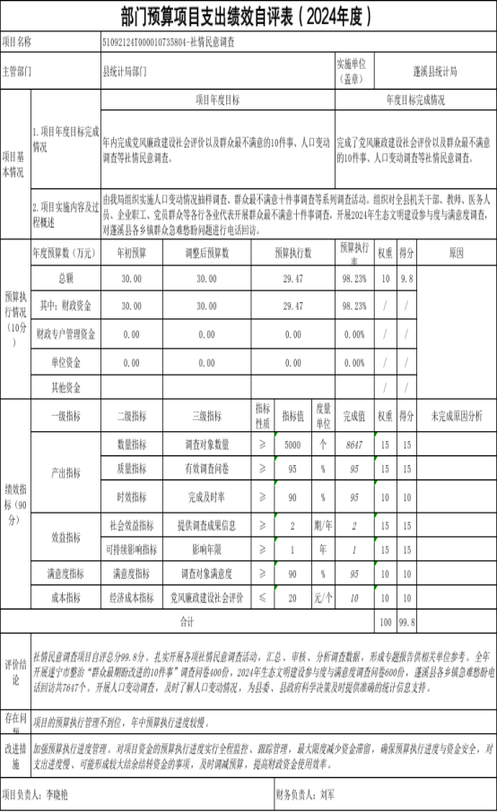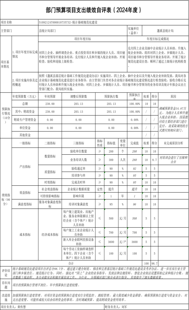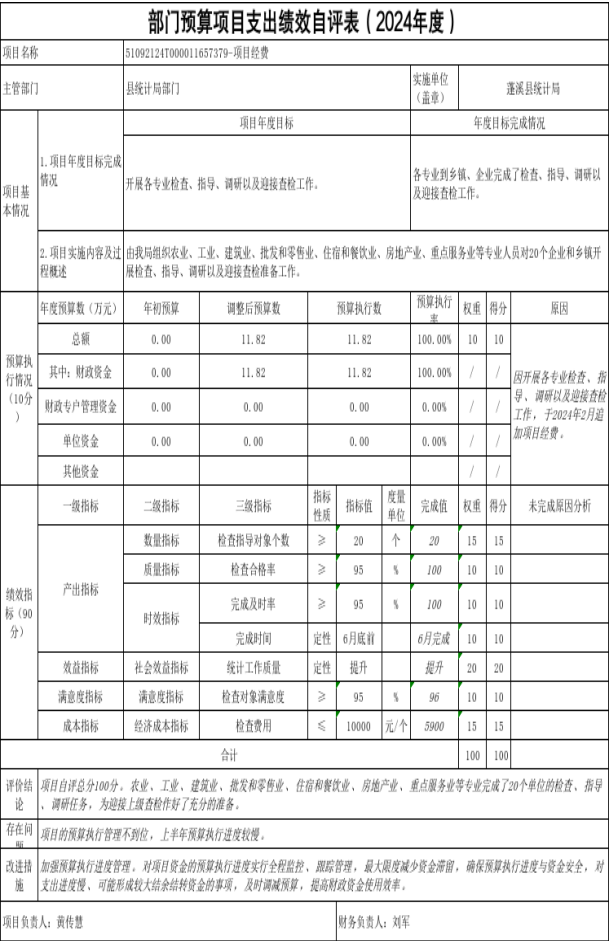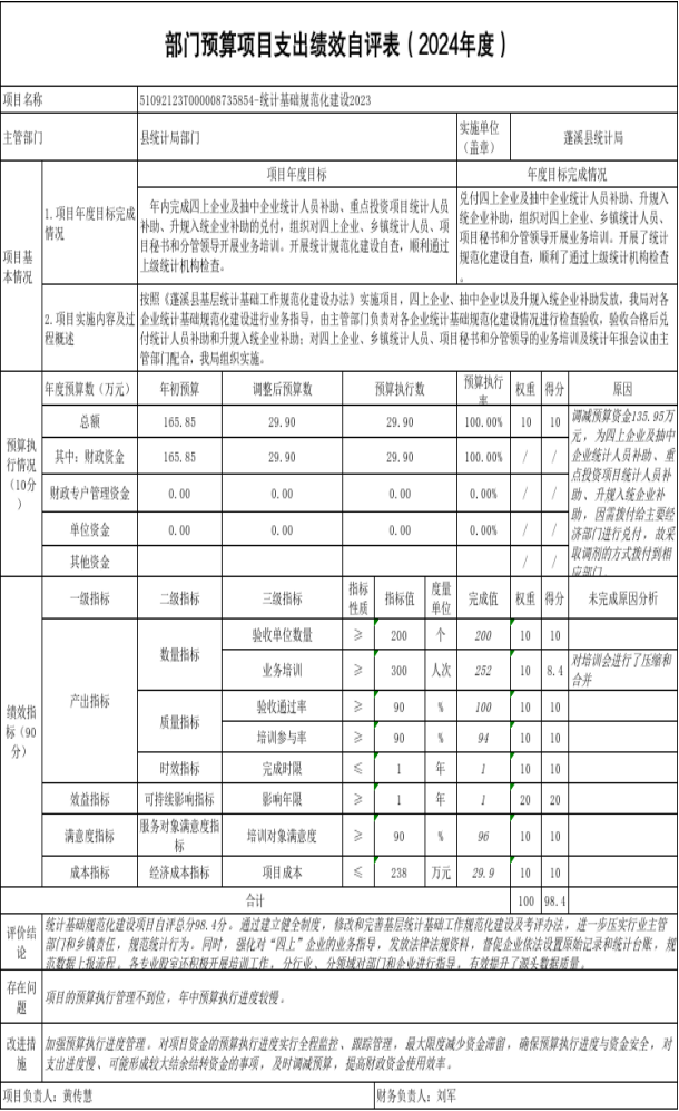 组织对2024年度一般公共预算、政府性基金预算、国有资本经营预算、社会保险基金预算以及资本资产、债券资金等全面开展绩效自评,形成蓬溪县统计局部门整体(含部门预算项目)绩效自评报告,自评得分为88.9分,绩效自评综述:2024年我局及时、优质地完成预算编制,支出管理规范;资金管理制度较为完善,会计核算和账务处理规范,会计资料真实、完整,整体绩效良好。绩效自评报告详见附件。