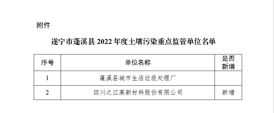为切实加强土壤污染防治工作,持续改善土壤环境质量,根据《四川省生态环境厅办公室关于做好2022年度土壤污染重点监管单位管理工作的通知》(川环办函〔2022〕58号)、《遂宁市生态环境局办公室关于做好2022年度土壤污染重点监管单位名单管理工作的通知》要求,现将蓬溪县2022年度土壤环境重点监管单位名单公布如下: