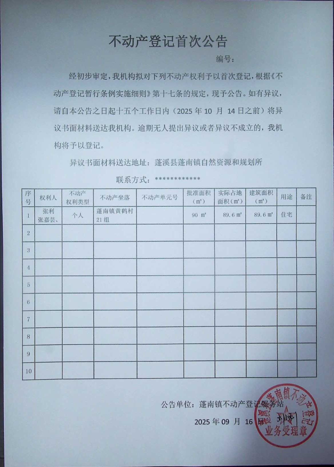 首次登记公告(张利)