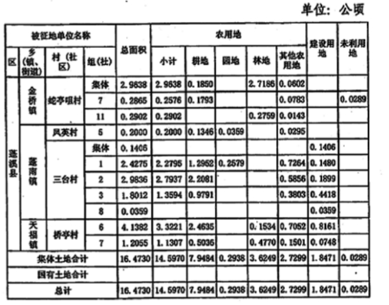本次征收蓬溪县金桥镇蛇亭咀村7、11组、村集体;蓬南镇凤英村5组,三台村1、2、3、8组、村集体;天福镇桥亭村6、7组土地16.4730公顷(见下表),具体位置详见《勘测定界图》。