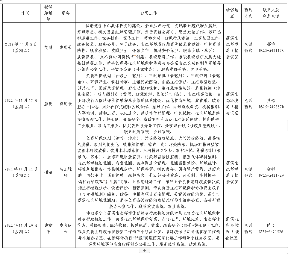 为深入贯彻习近平生态文明思想和习近平总书记关于加强和改进人民信访工作的重要论述,切实增强宗旨意识,不断提升人民群众满意度和获得感,经研究,决定开展“服务群众办实事 遂宁市蓬溪生态环境局局长接待日”活动,现将2022年11月接访安排公告如下。