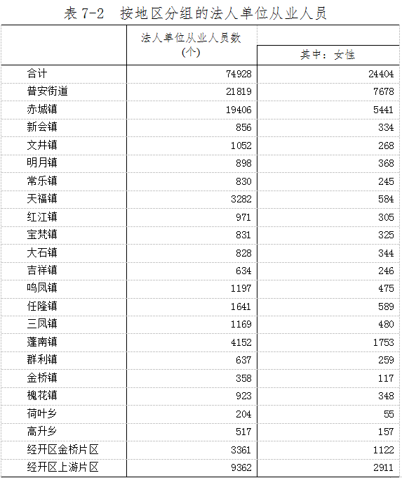 2023年末,从业人员主要分布在普安街道、赤城镇、经开区上游片区,这三个乡镇(园区)占全部法人单位的67.5%。其中普安街道21819人,占29.1%;赤城镇19406人,占25.9%;经开区上游片区9362人,占12.5%。