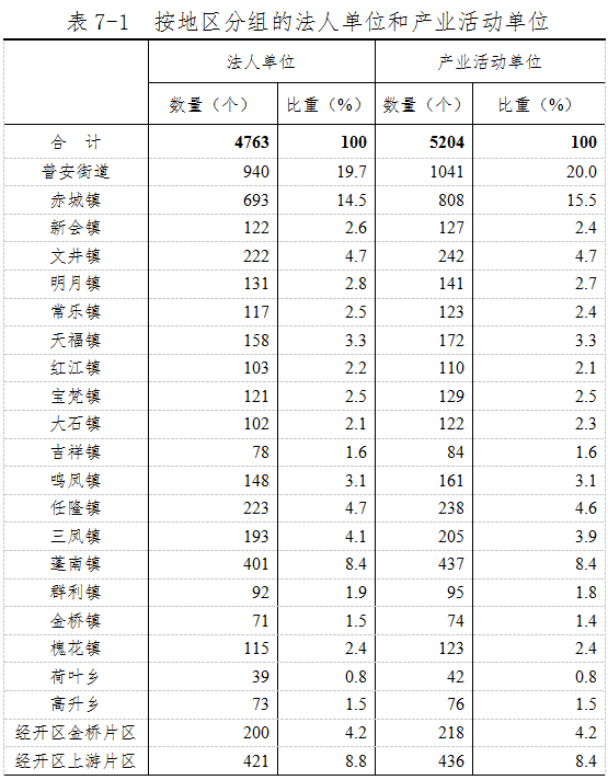 2023年末,全县法人单位主要分布在普安街道、赤城镇、经开区上游片区,这三个乡镇(园区)占全部法人单位的43.1%。其中普安街道法人单位共有940个,占19.7%;赤城镇法人单位共有693个,占14.5%;经开区上游片区法人单位共有421个,占8.8%。