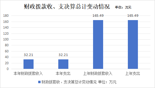 2023年度财政拨款收、支总计均为32.21万元。与2022年度相比,财政拨款收、支总计各减少133.28万元,下降805.36%。主要变动原因一是财政代缴城乡居民基本养老保险费支出为大财政支出不计入本单位;二是单位改革收入支出于2023年4月并入新单位。
