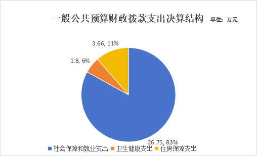 2023年度一般公共预算财政拨款支出32.21万元,主要用于以下方面:社会保障和就业支出26.75万元,占83.05%;卫生健康支出1.8万元,占5.59%;住房保障支出3.66万元,占11.36%。