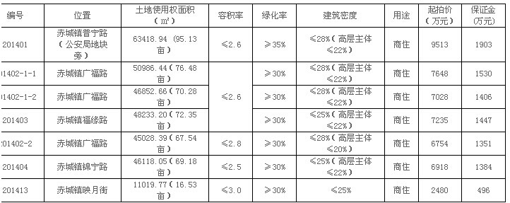 以上宗地土地用使用年限为商业用地40年,住宅70年。具体要求和其他规定详见拍卖出让文件。其中201401、201402-1-1、201402-1-2、201402-2、201403、201404、201413宗地按计入容积率的总面积3%配建公租房,而且201402-2宗地还先需配建学校一所(幼儿园和小学),公租房和学校建成后产权无偿移交政府。201402-1-1、201402-1-2、201402-2、201403、201404宗地作为一宗地进行拍卖。