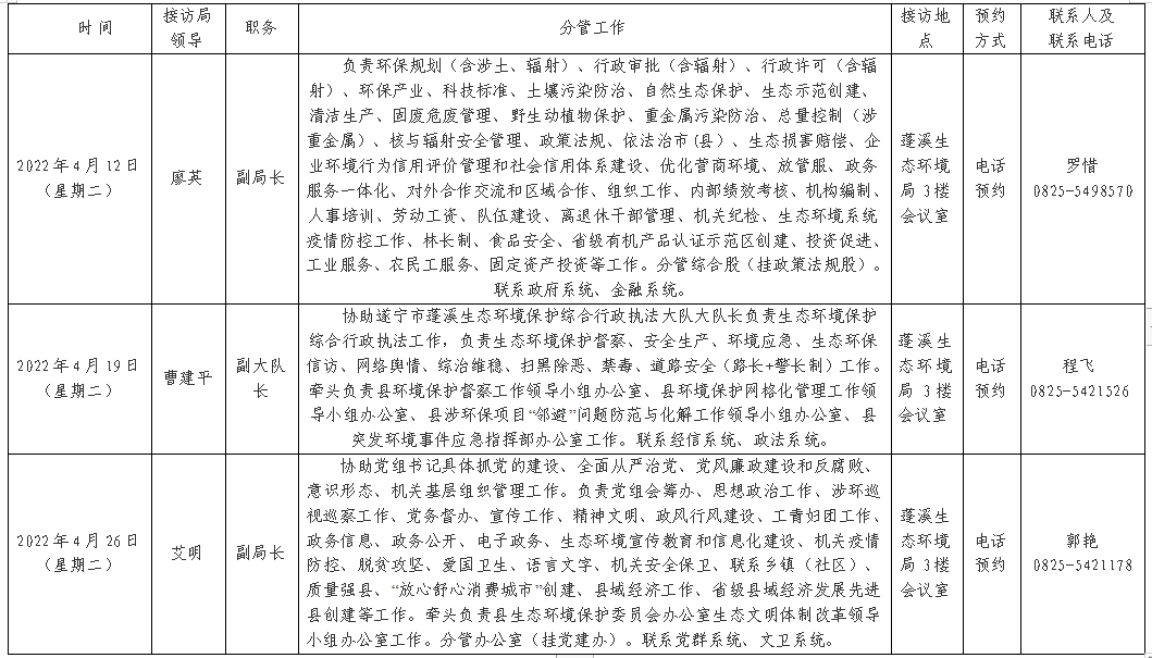 为深入贯彻习近平生态文明思想和习近平总书记关于加强和改进人民信访工作的重要论述,切实增强宗旨意识,不断提升人民群众满意度和获得感,经研究,决定开展“服务群众办实事 遂宁市蓬溪生态环境局局长接待日”活动,现将2022年4月接访安排公告如下。