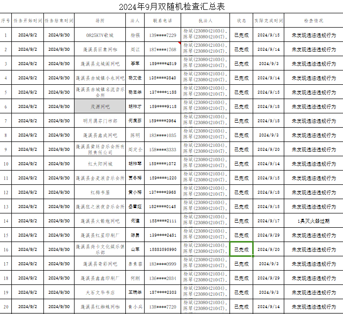 蓬溪县文化市场综合行政执法大队2024年9月双随机检查汇总表