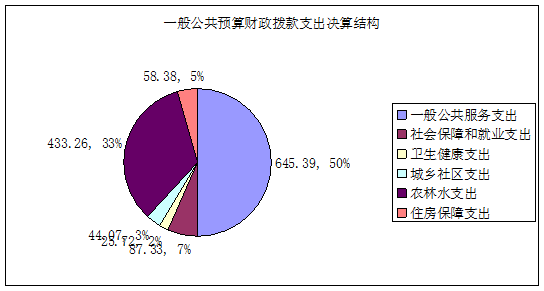 2024年度一般公共预算财政拨款支出1294.15万元,主要用于以下方面:一般公共服务支出645.39万元,占49.87%;社会保障和就业支出87.33万元,占6.75%;卫生健康支出25.72万元,占1.98%;城乡社区支出44.07万元,占3.41%;农林水支出433.26万元,占33.48%;住房保障支出58.38万元,占4.51%。
