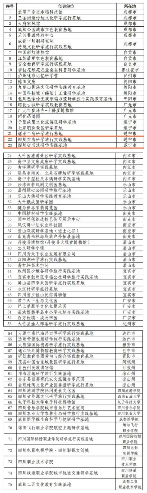 2022 年度省级研学旅行实践基地创建单位名单(其中,蓬溪2个上榜)