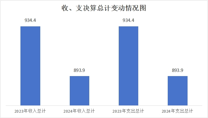 2024年度收、支总计均为893.90万元。与2023年度相比,收、支总计各减少40.50万元,下降4.3%。主要变动原因是2023年基本公用经费支出未完成支付。